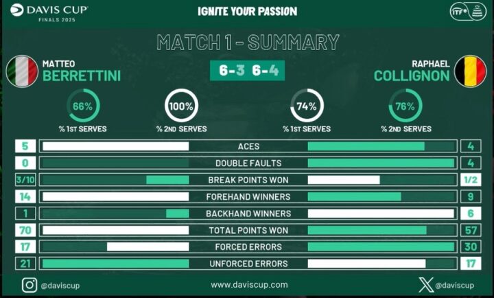 Matteo gioca un primo set quasi perfetto al servizio (solo 7 punti concessi e Collignon na vai mai oltre il “30”) e lo chiude in appena 35 minuti. Ma è altrettanto bravo nel secondo, quando nell’unico momento di appannamento vissuto nell’intero match, sotto 3-2 e palla break da fronteggiare (aveva avuto in precedenza due palle per il 3-0 “pesante” in suo favore), Berrettini salva la battuta, fa lui il break nel gioco successivo e poi tenendo due volte il servizio a zero porta il primo punto all’Italia. Quindi in conclusione una prova di grande solidità. Sperando che sia un ottimo viatico per l’accesso in finale dei nostri ragazzi.
