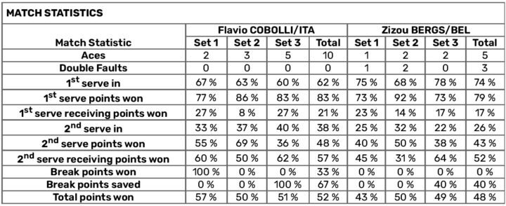 La partita si apre con due ace di Cobolli che fortunatamente compensano un paio di strafalcioni…c’è tensione in campo. Si prosegue on serve per un paio di games fino a che nel quarto tre grossolani errori di Bergs regalano il break all’Italia. E sul 3-1 si gioca più tranquilli come dimostra subito Flavio che tiene senza fatica i suoi turni di servizio fino ad affacciarsi a set point. E qui, pur con qualche incertezza, chiude alla quinta occasione utile sul punteggio di 6-3 in 35 minuti.