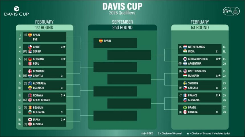 Nella giornata conclusiva della Coppa Davis 2025, prima dell’ultimo atto tra Italia e Spagna, si è svolto in sala stampa il sorteggio per il 1° turno dei Qualifiers 2026, che si svolgeranno ad inizio febbraio (6-7 o 7-8, saranno le federazioni ospitanti a scegliere le date del weekend).