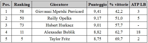 Non potevamo immaginare Alcaraz fuori dai primi tre, ma Lorenzo gli è dietro per un paio di centesimi. Anche i miglioramenti del classe 2002 di Carrara sul lato destro sono stati strabilianti se pensiamo a quando gli capitava di perdere quasi completamente fiducia nel dritto e si rifugiava nello slice, nel più classico dei “problemi” mentali che diventano tecnici.
