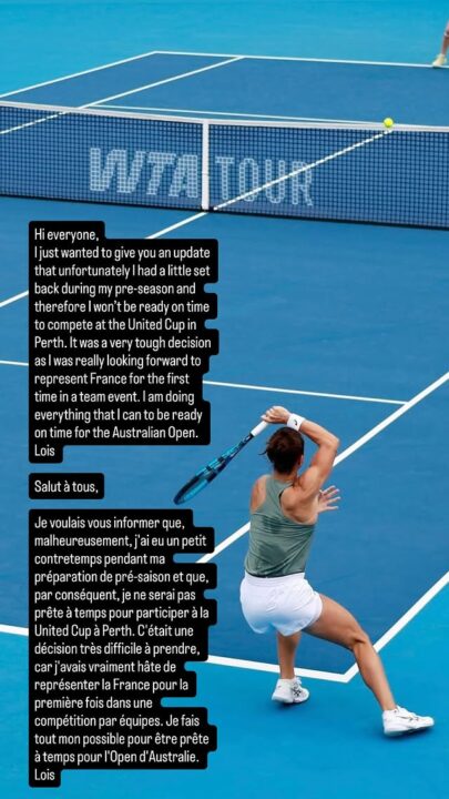 “Ho avuto un piccolo contrattempo durante la preparazione pre-stagionale”, ha spiegato la francese sul suo account Instagram. “Di conseguenza, non sarò pronta in tempo per partecipare alla United Cup a Perth. È stata una decisione molto difficile da prendere, perché non vedevo l’ora di rappresentare la Francia per la prima volta in una competizione a squadre. Sto facendo tutto il possibile per essere pronta per l’Australian Open”.
