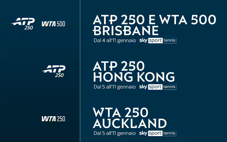 Riparte alla grande la stagione del tennis su Sky e in streaming su NOW. Quattro i tornei che saranno trasmessi in diretta da domenica 4 a domenica 11 gennaio 2026: due del circuito maschile ATP, due del circuito femminile WTA.