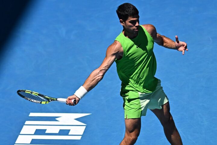 L’outfit di Alcaraz per questi Australian Open potrebbe tranquillamente finire nella lista dei più iconici della sua carriera. Tutto perfettamente azzeccato: colori, motivo, fit. Ineccepibile. Versione giorno total fluo green con due tonalità diverse: più accesa per la canotta, più tenue per i pantaloncini. Calzetto bianco, scarpe a richiamo. Versione notte con inserimento del nero e del bianco insieme al verde fluo. Una sorta di onda continua che collega smanicato e pantaloncini che sembra un po’ un richiamo allo smanicato carta di zucchero di Nadal all’inizio della stagione 2007, forse uno dei look più memorabili del fenomeno di maiorchino. Anche se qua l’allievo comincia a superare il maestro. E non solo in fatto di canotte. Centratissimo, giovanile ma al contempo chic, anche il look per il photoshoot con il trofeo, con particolare riferimento alla work jacket nera griffata Louis Vouitton, marchio di cui il portento di Murcia da qualche tempo è testimonial. Voto 8