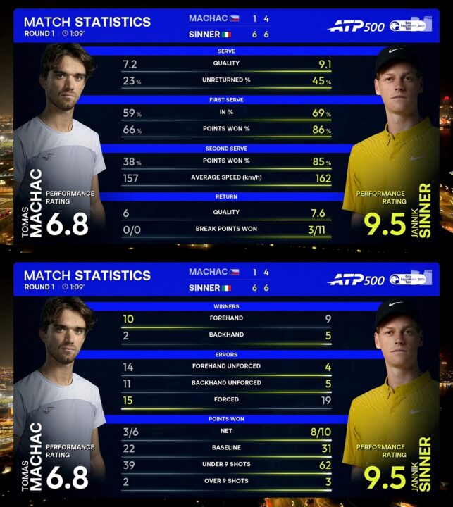 11 le palle break concesse dal ceco, nessuna per Sinner. 25 errori gratuiti per lo sconfitto, la miseria di 9 per il vincitore.