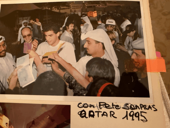 “Pistol Pete” Sampras aveva ricevuto un sontuoso ingaggio di mezzo milione di dollari per la sola partecipazione! Non ebbi l’impressione che si fosse impegnato al massimo, ma forse era rimasto vittima del jet lag. Dalla California al Qatar non è una passeggiata. Sono una quindicina di ore di volo. Ho una mia foto di allora con lui appollaiato su un cammello per la gioia dei fotografi e io ai piedi di quel cammello, con lui sorridente. Se la ritrovo la metto qui. Pete si era fatto accompagnare dalla bellissima e ricchissima fidanzata, Delaina Mulcahy. Quel torneo fu vinto da Edberg, testa di serie n.3 su l’olandese Haarhuis che aveva battuto sia Alami sia Ivanisevic (con il croato che aveva sconfitto Stefano Pescosolido). Stich, favorito n.2, aveva perso al secondo turno dall’haitiano Agenor.
