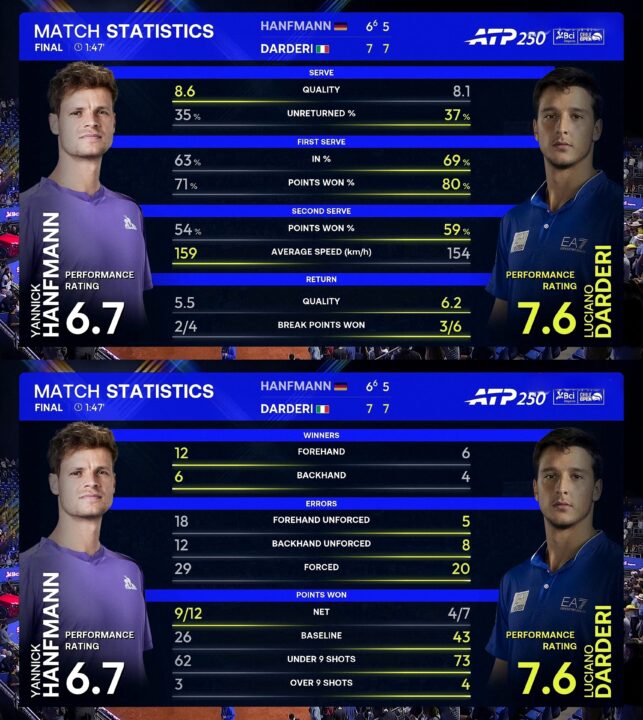 Nel secondo set il canovaccio si inverte. Il servizio perso sull’1-1 costringe Darderi a rincorrere. Tuttavia, la sua reazione è immediata e mette a segno il controbreak nel quarto gioco. Le occasioni per il tennista in risposta sono ridotte al lumicino fino all’ultimo game. Luciano si garantisce il secondo tiebreak dell’incontro con un turno a 15, ma fiuta l’attimo propizio per dare la sterzata decisiva al match, procurandosi due match point in risposta. Gli basta il primo per conquistare il quinto titolo ATP in sei finali. Per Hanfmann, invece, la ricerca del primo trofeo deve proseguire ancora, ma balza dalla posizione numero 81 alla 65 delle classifiche.