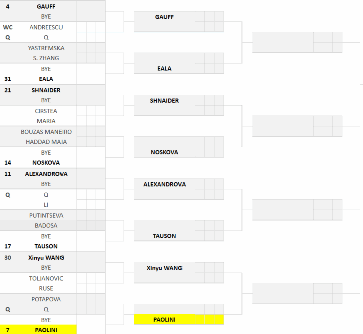 L’unica italiana nel tabellone principale al momento è Jasmine Paolini, testa di serie n. 7, che è stata sorteggiata nella parte alta del tabellone e potrebbe avere Xinyu Wang al terzo turno, Ekaterina Alexandrova agli ottavi e Gauff o Noskova nei quarti.