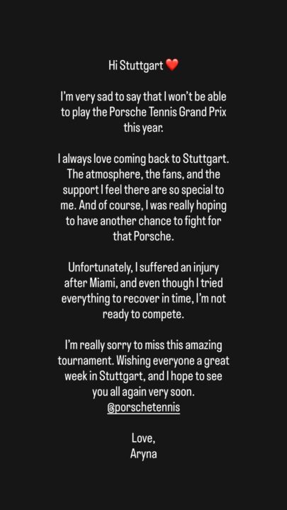 Ma la tournée sul cemento è oramai bella che andata e Sabalenka tornerà in Europa per dar inizio al suo swing sul rosso, sebbene ciò non accadrà certamente nel torneo di Stoccarda. A ridosso del Porsche Tennis Grand Prix (13 – 19 aprile), la campionessa nativa di Minsk ha annunciato sui social di dover fare a meno della tappa sul tappeto rosso tedesco a causa di un infortunio: “Mi dispiace molto dover dire che quest’anno non potrò partecipare al Porsche Tennis Grand Prix – ha rivelato sulle instagram stories -. Mi piace sempre tornare a Stoccarda. L’atmosfera, i tifosi e il sostegno che ricevo lì sono davvero speciali per me. E, naturalmente, speravo davvero di avere un’altra occasione per lottare per quella Porsche. Purtroppo, ho subito un infortunio dopo Miami e, anche se ho provato di tutto per recuperare in tempo, non sono pronta per gareggiare. Mi dispiace davvero molto dover saltare questo fantastico torneo. Auguro a tutti una settimana fantastica a Stoccarda e spero di rivedervi tutti molto presto”.