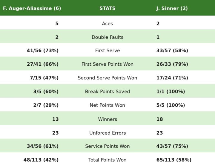 Poco male, perché due drop shot lo riportano a palla break, su cui Auger-Aliassime commette doppio fallo:allungo agilmente consolidato e 5-2. FAA fa il suo per restare nel set, ma altrettanto fa Sinner, il cui dritto è velocemente tornato a essere solido e micidiale, ci mette pure un rovescio lungolinea a punire l’altrui attesa del colpo verso sinistra e chiude 6-3. Netta superiorità negli scambi medi, 10 vincenti e 11 errori (4-9 il bilancio canadese) e, unico aspetto rivedibile, solo metà delle prime in campo, ma contro Felix – più che altro attento a ribattere dentro le righe – va anche troppo bene.