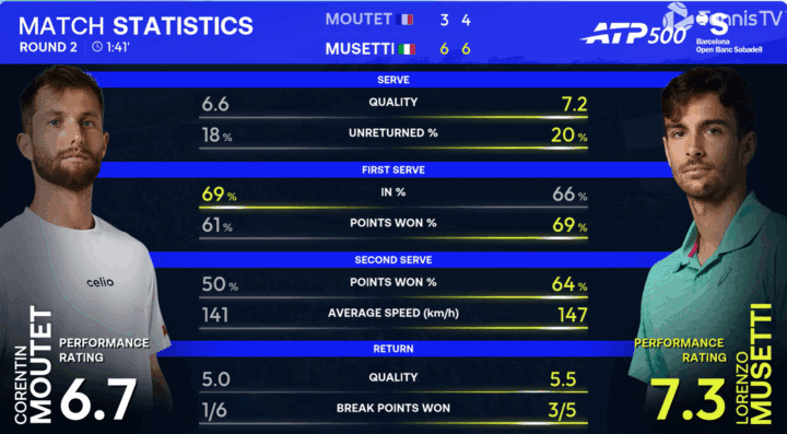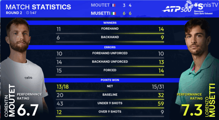 Come detto da Musetti nell’intervista a caldo post partita alla televisione spagnola, partita che ha fatto onore alla superfice, la terra battuta. Si vedono variazioni, e scambi combattuti, per la gioia del pubblico. Non a caso sull’account twitter ATP di tennis tv ci sono ben 6 clip e una di riepilogo, probabilmente un record per una partita di due set. Alla fine a spuntarla è Musetti, ma Moutet ha venduto cara la pelle.