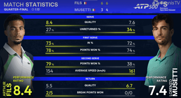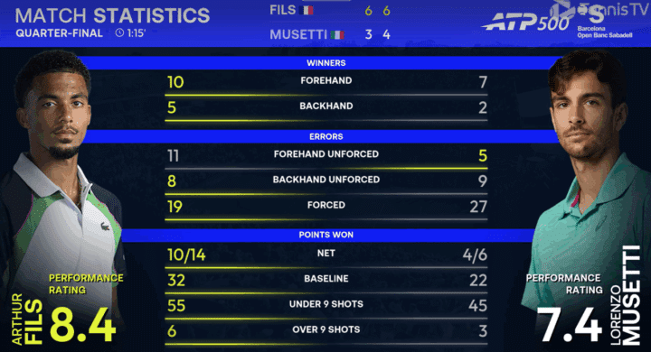 Nono game nel quale Fils torna a farsi minaccioso e sale a 0-30. Musetti riesce a contenere con il rovescio slide e approfitta di un errore del francese, ma alla fine Fils continua a spingere imperterrito e sale a palla break, che ha il sapore di match point. Si gioca sulla seconda di Lorenzo. Parte uno scambio di rovesci incrociati sul quale alla fine è Lorenzo ad arrivare scarico. BREAK FILS. MUS 4-5 FIL.