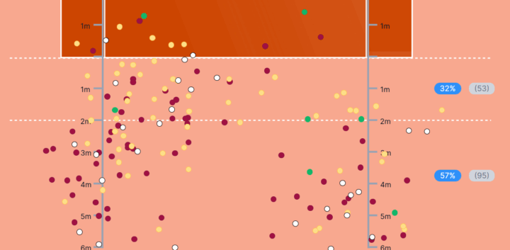 Fonte: Analysis by TennisViz; Data provided by Tennis Data Innovations – Musetti, distribuzione della posizione dei punti di impatto dei colpi.