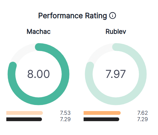 Match di qualità nel quale entrambi stanno giocando al di sopra dei propri standard. il dato rappresentato dalla barra gialla è la media della performance dei singoli giocatori, mentre il dato rappresentato dalla barra nera è la media ATP, sempre calcolate sulle ultime 52 settimane di partite giocate.
