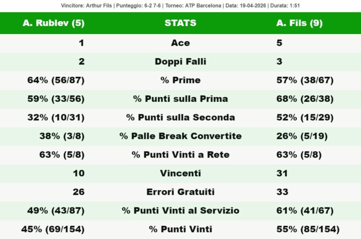 Partita dominata da Fils che solo nel finale ha tentennato un po’, salvo riprendere il secondo set per i capelli, dopo un primo parziale dominto. Per il francese ennesima grande prestazione a Barcellona. Durante questa settimaa un livello di gioco da top 5 per Fils. Il francese si rimette in ottima posizione per aggiudicarsi nuovamente il bonus pool per i tornei di categoria 500.