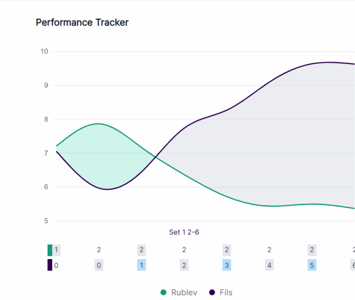 Rublev non sembra aver armi per contrastare FIls. Il russo non avendo nel proprio bagaglio variazioni o soluzioni tattiche tali da scompaginare la soldità di FIls. Set che finisce in 30 minuti esatti, con FIls che tiene aperta la striscia di game vinti. FIL 6-2 RUB.