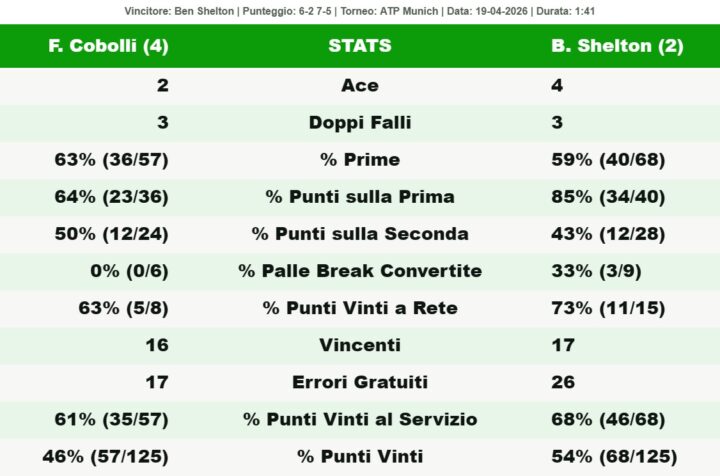 Shelton, invece, strappa il suo primo successo contro un top 20 sul rosso (era 0-4 prima di questa partita). Agguanta il suo quinto titolo, il secondo sul rosso, il terzo a livello 500 – primo statunitense a riuscirci dal 2009 – e il secondo in stagione dopo Dallas. Risultato che gli permette di affiancare Jannik Sinner tra i tennisti capaci di vincere sia sul rosso che sul cemento in questo 2026. Diventa poi il primo giocatore a stelle e strisce capace di laurearsi campione a Monaco di Baviera da Ivan Lendl nel 1993 e riporta in America un titolo sul rosso più prestigioso di un 250 dopo 24 anni (!), ovvero da un Andre Agassi vittorioso a Roma nel 2002. Ma soprattutto, si inserisce tra i nomi da tenere d’occhio anche su questa superficie. A Madrid, in altura, sarà senz’altro un avversario scomodo per chiunque. E con i forfait di Carlos Alcaraz e Novak Djokovic sarà sicuro di essere una delle prime quattro teste di serie.